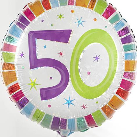 Send a helium filled birthday balloon and give their 50th birthday a dash of colourful fun. This eye-catching design features a bright metallic border, silver sparkles and a large ’50’ motif. The circular 48cm micro-foil balloon arrives filled with helium and tied to a weight with curling ribbon.