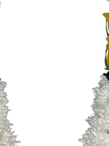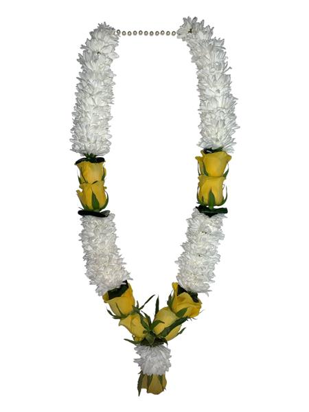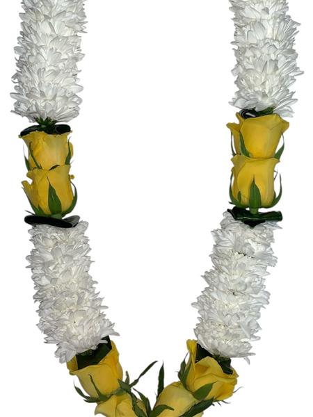 Beautiful garland made with white chrysanthemum and yellow roses with flat green leaves, arranged ideally for any occasion.