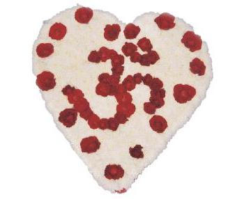 A beautiful Aum Tribute engraved in middle of Heart. Made with Fresh Red Roses and White chrysanthemums with ribbon trimming.