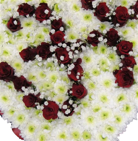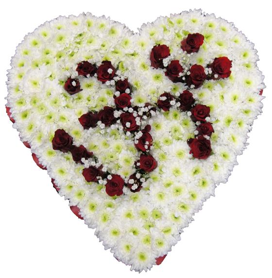 A beautiful Aum Tribute engraved in middle of Heart. Made with Fresh Red Roses, Gypsophilia And White chrysanthemums with ribbon trimming.