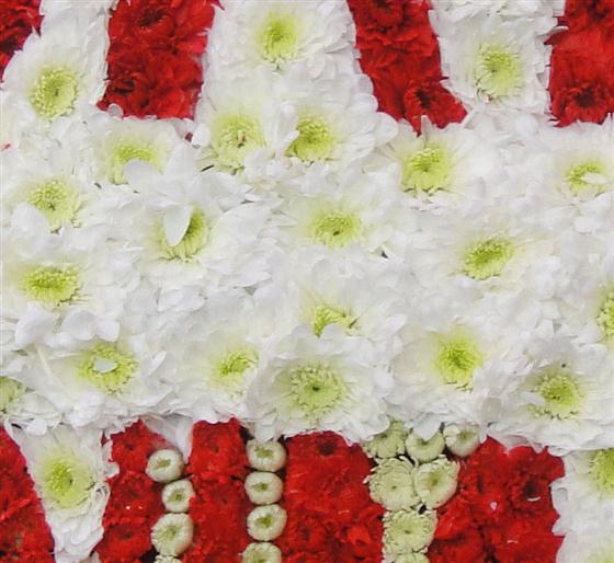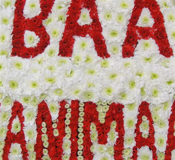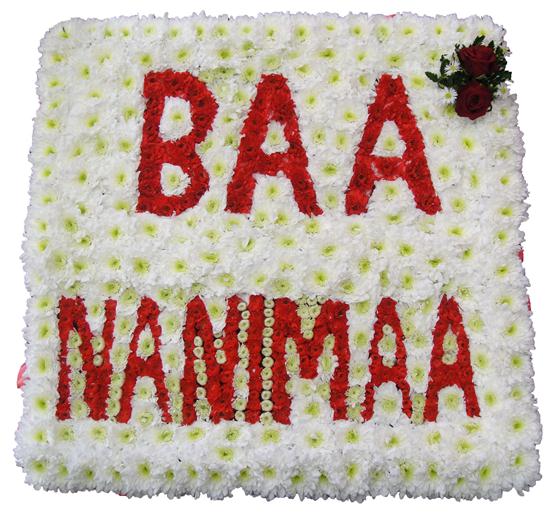 Baa And Nanimaa tribute made on a large Oasis floral foam base with Fresh chrysanthemums.