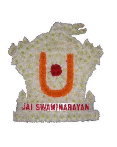 An Akshar Deri made with orange flowers on a white base of chrysanthemums with a 'Jai Swaminarayan' sash.