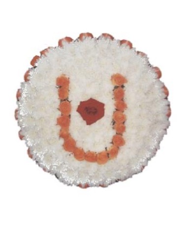 A Swaminarayan symbol made with orange roses on a white chrysanthemum base, with an orange ribbon border.