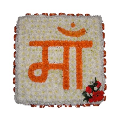 The word 'Maa' made with dyed flowers on a white base of chrysanthemums with a small, delicate arrangement in the corner and an orange ribbon finish.