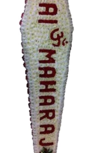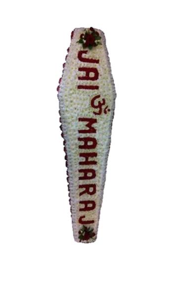 A red and white chadar made of chrysanthemums with the words 'Jai Maharaj' in red with two accompanying red rose arrangements. Completed with a red ribbon finish.