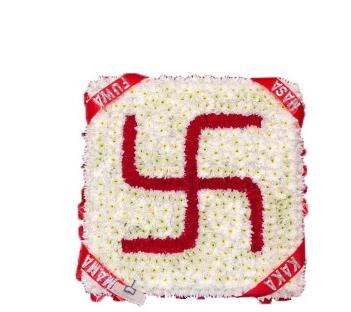 A red Swastik made on a white base of chrysanthemums with a red ribbon finish that can have word relations such as 'Dad' customised to your preference.