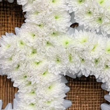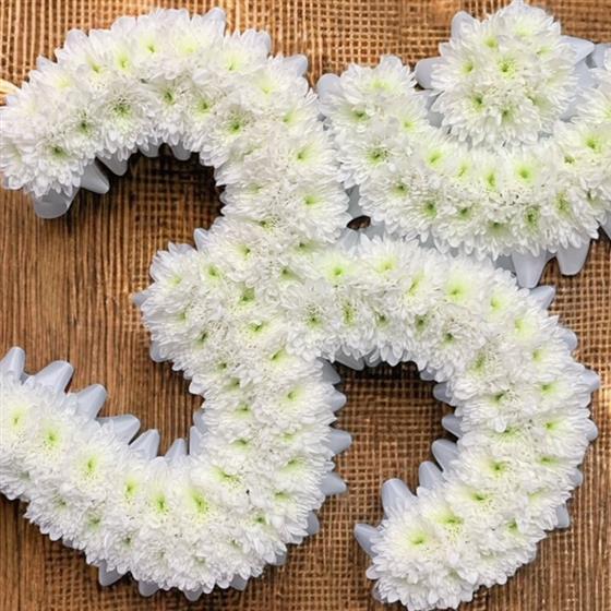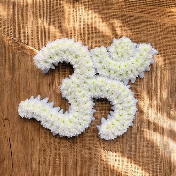AUM tribute symbol, made on a large Oasis floral foam base with white chrysanthemums