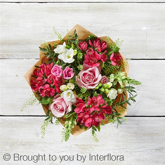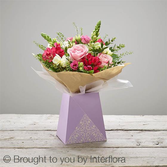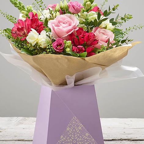 Featuring pink large headed roses, cerise alstroemeria, white freesia, white antirrhinum, thlaspi, eucalyptus and salal, beautifully arranged in a gift box.