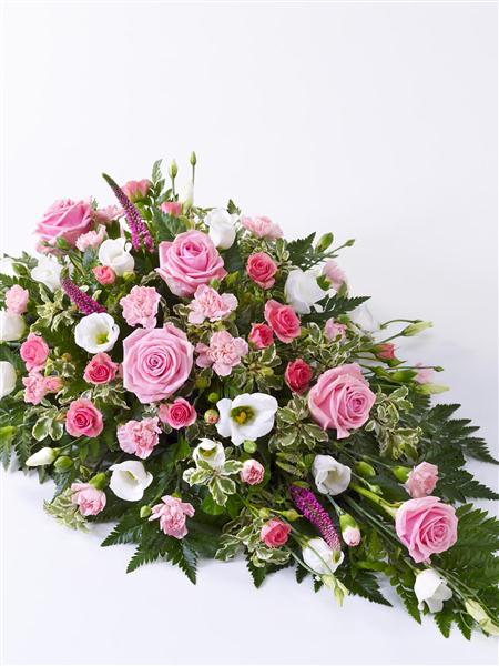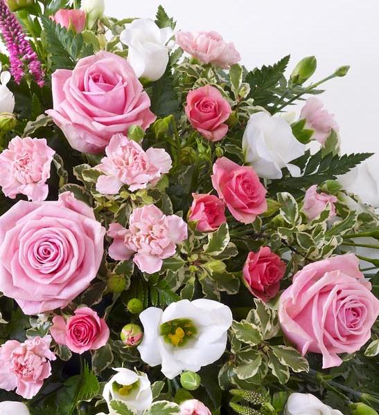 A beautiful tribute for a baby girl, this pretty pink spray features large-headed roses, spray carnations and spray roses in soft pink, interspersed with dark pink Veronica and delicate white lisianthus. It is finished with leather leaf and pittosporum.