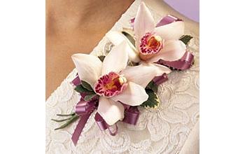A dress/jacket corsage of a double cymbidium orchid with green leaves. Violet ribbon has been added to give this corsage extra sparkle.