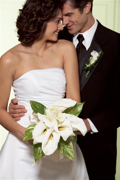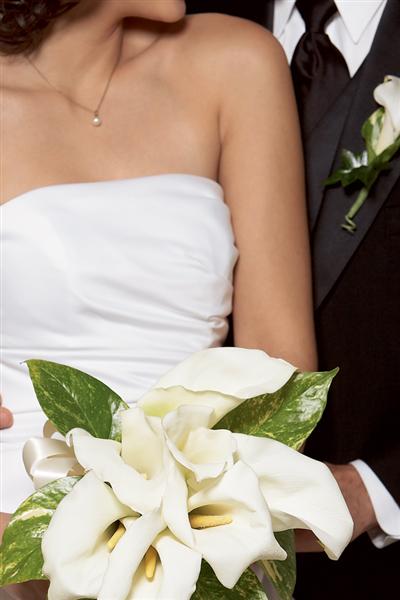 Featuring 5 white calla lilies with pothos leaves, hand-tied and finished with ivory satin ribbon. This hand-held bouquet is approximately 23cm (w) by 30cm (l).