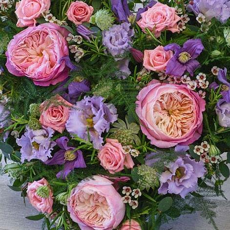 Featuring stunning garden roses, delicate lilac lisianthus and scented rosemary, this heart tribute is full of beautiful tones.