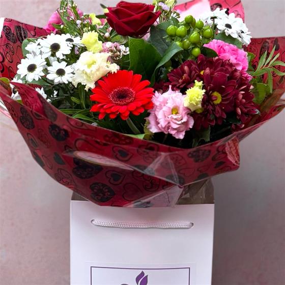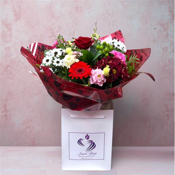 Expertly arranged and presented in a stylish gift bag with decorative wrapping, this bouquet offers a thoughtful and ready-to-gift option for Valentine's Day, birthdays, celebrations, thank-yous, or simply to brighten someone’s day.