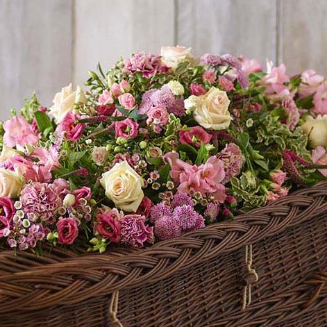 A flowing style of spray that covers the top of the casket with a profusion of blooms including lisianthus, alstroemeria, roses, and chrysanthemums.