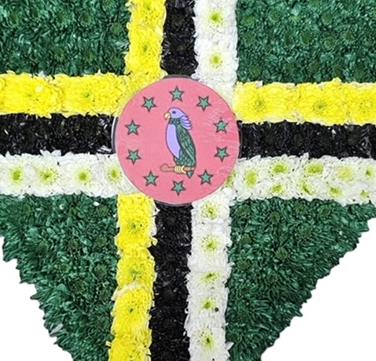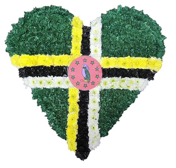 Made with a chrysanthemum a 15" base with Dominica flag colours heart engraved in the middle of the heart dyed with the colour of your choice and trimmed with ribbon.