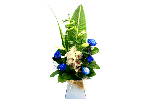Flowers: White Orchid, Blue Roses Roses & White Lilies, Lucky Bamboo & Foliage