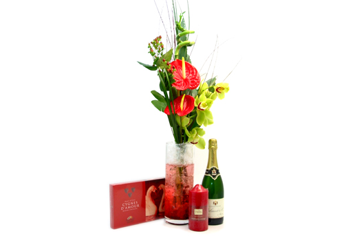 Shower your love with this simple but stylish Vase Arrangement along with Bouchard L’escaut Luxury Chocolates, Scented Candle and Superior Champagne