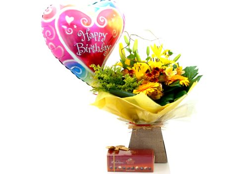 Spoil someone on their birthday with this pretty Hand-Tie Bouquet of seasonal flowers together with a Balloon and Belgium Luxury Chocolates