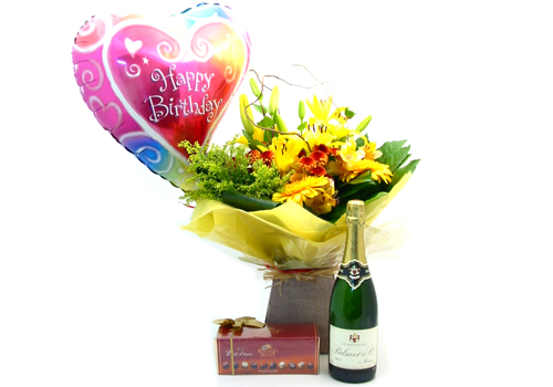 Make someone’s birthday a memorable one with this attractive Hand-Tie Bouquet of seasonal flowers accompanied with a Balloon, Belgium Luxury Chocolates & Superior Champagne
