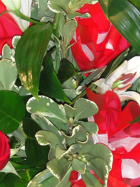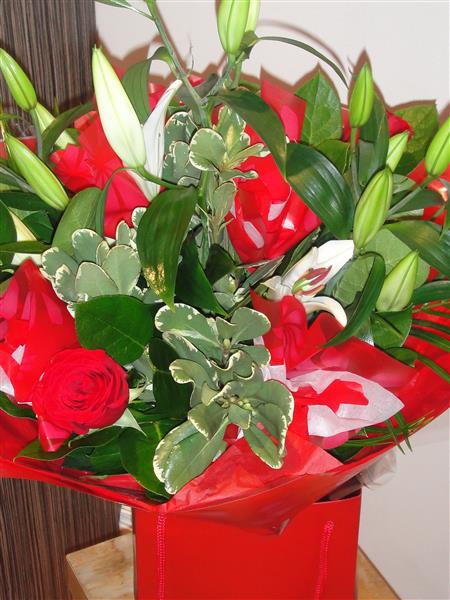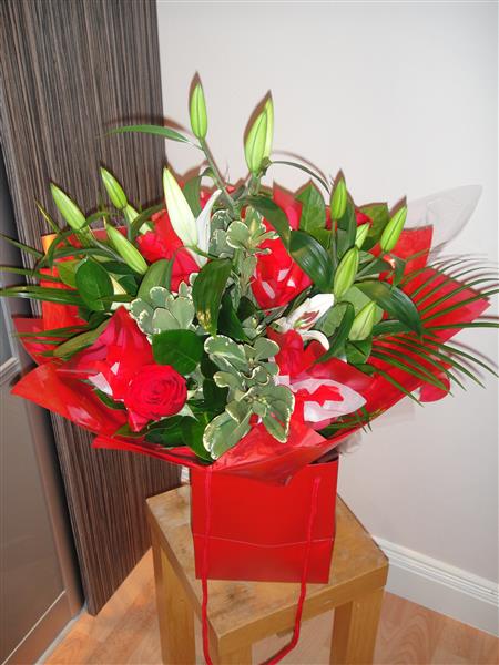 Featuring red large-headed roses, White oriental lilies,and pittosporum, finished with gift wrap and ribbon.