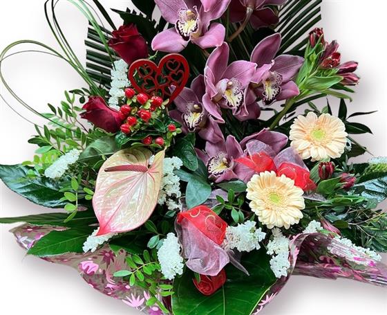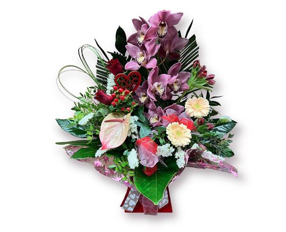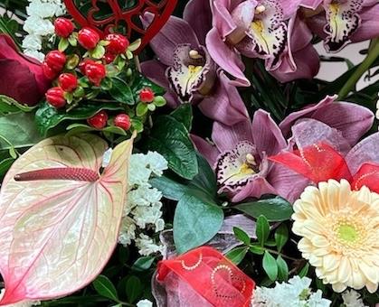 This arrangement has an assortment of scented lillies, geminis, red roses, hypericum berries and statice topped with a tropical orchid alongside an anthurium.