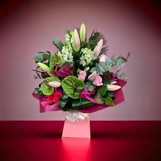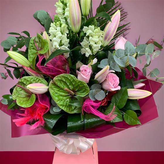 Features blushing pinks and greens with roses and scented lilies presented with various greenery and decoration presented with a fancy bow and water-based tall box