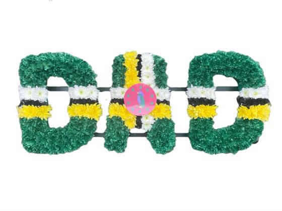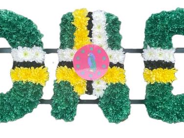 Made with a chrysanthemum base finished with Ribbon trimming, Available in any name or relation in floral letters A to Z or 1 to 0 (maximum 8 characters per tribute)