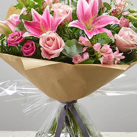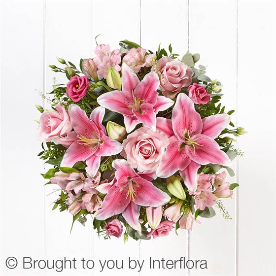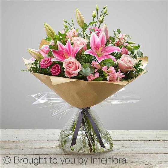 Featuring pink large headed roses, pink alstroemeria, pink oriental lilies, pink lisianthus and thlaspi, hand-tied with eucalyptus and pistache, finished with gift wrap and ribbon, presented in Interflora gift packaging.