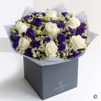 Featuring Ice Bear cream roses, purple double lisianthus and fresh limonium, expertly hand-tied and finished with luxurious Vera Wang gift wrapping.