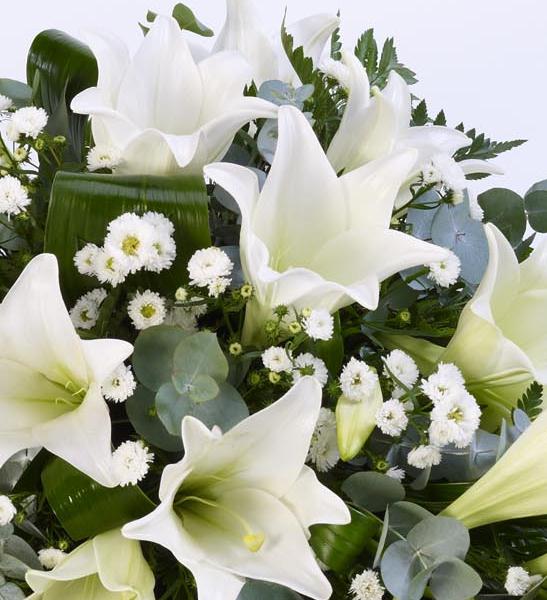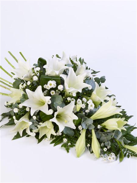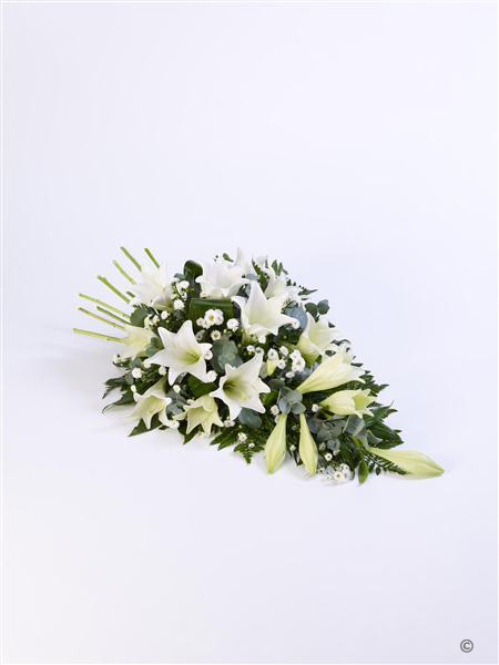 Classic white Longiflorum Lily are beautifully complemented by white September flower and choice foliages to create this elegant spray.