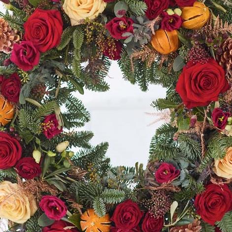 A classic Christmas wreath of fresh foliage and dried fruits, expertly arranged with care by a local florist.