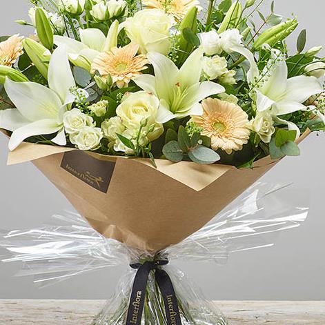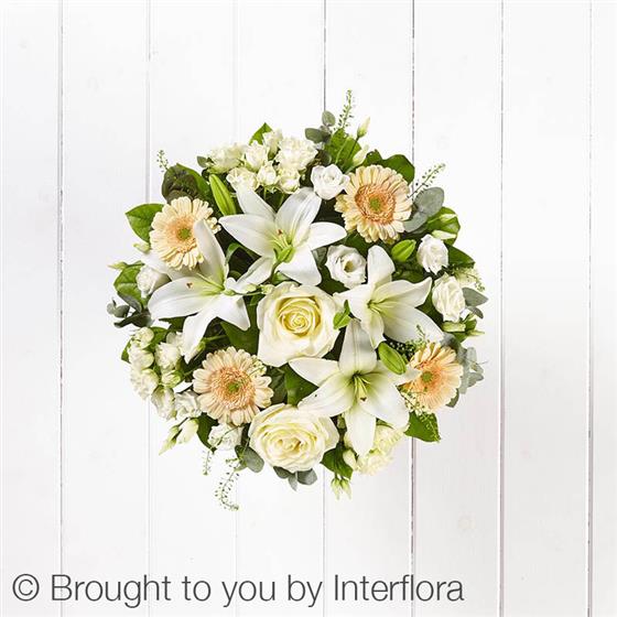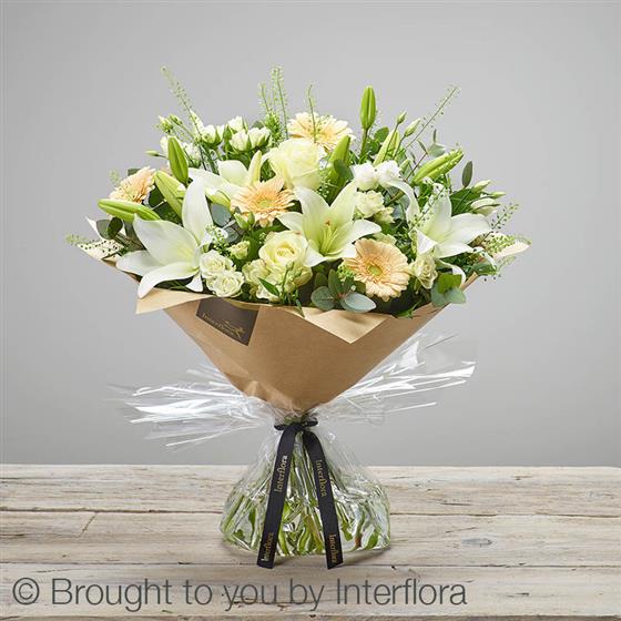 Featuring ivory large headed roses, white LA lilies, white lisianthus, white spray roses, cream germini and thlaspi, hand-tied with salal and eucalyptus, presented in Interflora Gift Packaging.