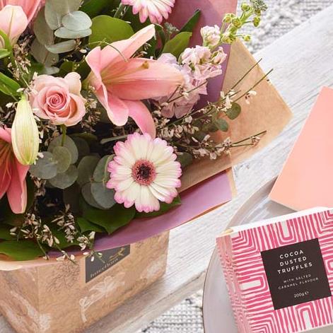Treat mum to...treats! This gorgeous gift bundle includes a handcrafted bouquet featuring the finest blooms in soft, dreamy colours like pinks, lilacs, peaches and creams, with hints of cerise and green.