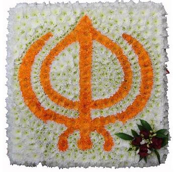 Khanda is a symbol of the unity of God in Sikhism. A beautiful Khanda tribute engraved in middle of large Oasis floral foam base and made with fresh chrysanthemums with ribbon trimming.