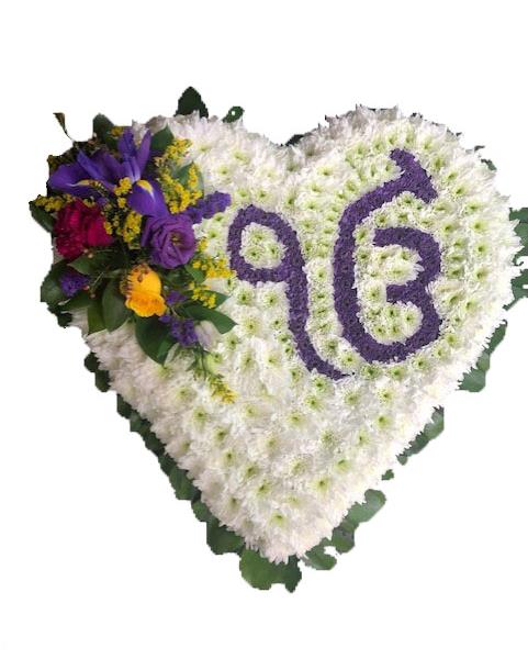 A Symbol of Sikhism Ek Omkar sprayed symbol is made on a heart Shape Oasis floral foam base with chrysanthemums Along with green leaf edges.