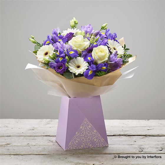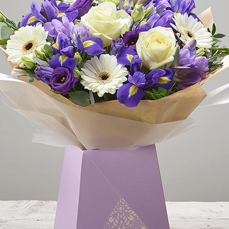 Featuring ivory large headed roses, purple freesia, white germini, purple lisianthus and blue veronica with pistache, presented in a gift box.