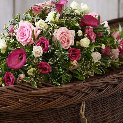 Elegant blooms, including roses and chrysanthemums, contrast with lush foliage in this small casket spray.