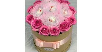 As one of our most popular gifts, this beautiful collection of 12 large Superior pink roses with diamonds along with Raffaello white chocolate, presented in a large luxury hat box.