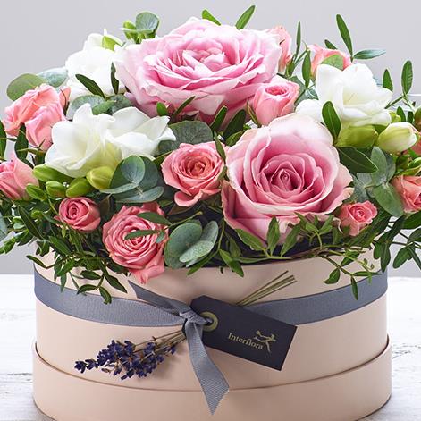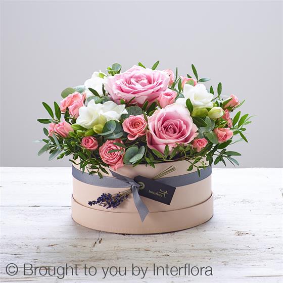 Featuring pink large headed roses, pink spray roses, white freesia, dried lavender, eucalyptus and pistache, beautifully arranged in a soft nude 'keepsake' hatbox trimmed with ribbon.