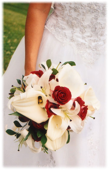 A simple fragrant bridal posy of 'red' roses, white calla lilies, oriental lilies,with pretty trailing ruscus creating an informal pretty feel for this lovely wedding bouquet..