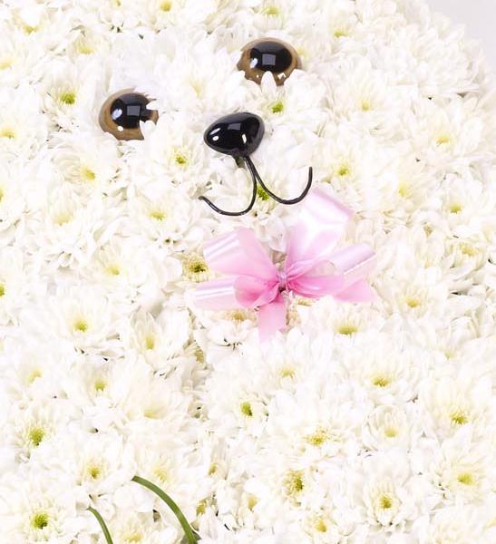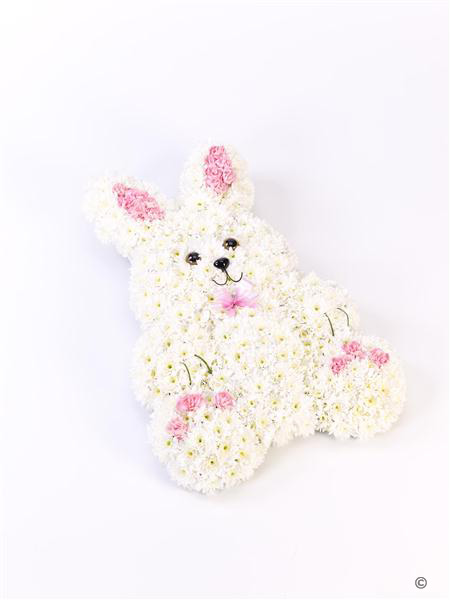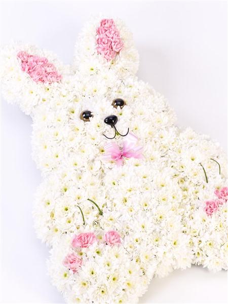 This sweet floral tribute in the shape of a rabbit features fresh white double spray chrysanthemums and contrasting pink spray carnations. It is trimmed with a matching pale pink ribbon and green steel grass.