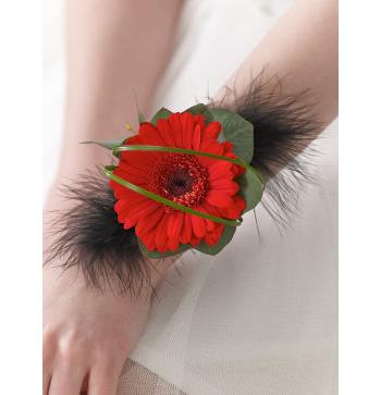 Add a touch of drama to that special outfit with this beautiful wrist corsage in red and black. The radiant shade of this scarlet germini is particularly striking. Set against black feathers and greenery, the effect is one of decorative grandeur.