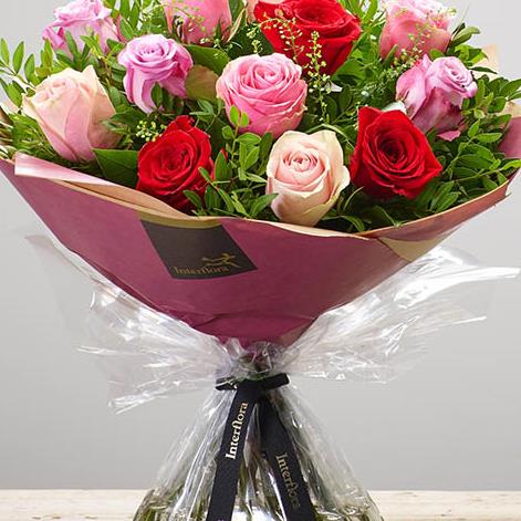 Featuring a mix of pink, lilac and red large headed roses with pistache, salal and thlaspi hand-tied, wrapped and presented in Interflora gift packaging.
