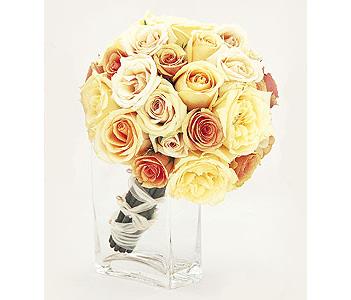 Luxurious Cream roses form a lovely compact domed shape for this wedding bouquet.A collar of skeleton leaves and glossy green foliage add extra interest. The stems are left longer and bound with a cream ribbon trimmed with pearl pins - so simple so elegant!