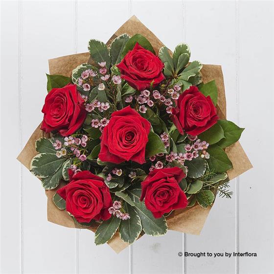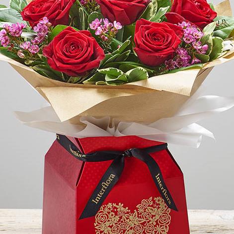 Featuring red large headed roses with thlaspi, pittosporum and salal, presented in a pretty gift box.