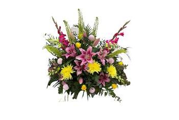 alstroemeria and carnations are arranged amongst pink Oriental Lily and white or cerise gladioli bloom with seasonal flowers made in a white plastic water base container along with lush greens.