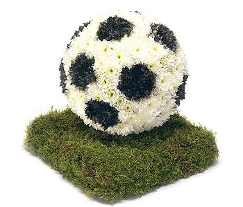 A mass of white double spray chrysanthemums are used in this football-themed three dimensional tribute, with some sprayed black to create the distinctive pattern. The football is then displayed on a moss-covered base.