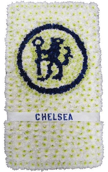 A Chelsea tribute made on a large Oasis floral foam base with chrysanthemums and spray with colours. And finished with ribbon trimming.