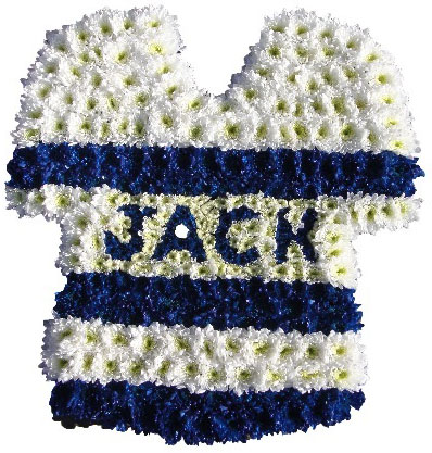 Double spray chrysanthemums and spray with blue colour to create this blue and white football shirt design. With text of your choice engraved in the middle.