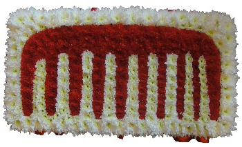 A Comb design engraved in the middle of large oasis floral foam base with double spray chrysanthemums with ribbon trimming.